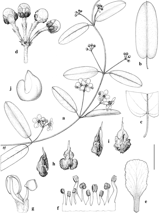 Stigmaphyllon calcaratum. a. Flowering branch. b. leaf. c. Base of leaf, abaxial view. d. Umbel. e. Posterior petal. f. Androecium laid flat, adaxial view, stamen second from left opposing the posterior petal. g. Gynoecium, anterior style to the right. h, i, Lateral (left) and adaxial (right) views of two samaras. j. Embryo.