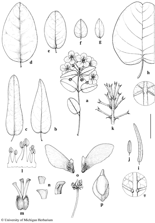 Scale bar equivalents: a–j, 4 cm (detail of h, 8 mm; detail of i, 4 mm); k, 8 mm; l, m, 4 mm; n, 2 mm; o, 1.3 cm; p, 4 mm. Based on: a, k, Valeur 416; b, Yuncker 17293; c, Liogier 15180; d, Liogier 17597; e, Howard & Howard 8649; f, Liogier 14820; g, m, Liogier 12442; h, Yuncker 18144; i, Liogier & Liogier 26900; j, Leonard & Leonard 11787; l, p, Yntema 354A; n, Liogier 12442 (anterior style, above, and posterior style), Yntema 354A (anterior style, below); o, Leonard 12352 (left), Yntema 354A (right). Drawn by Karin Douthit. First published by C. Anderson in Contr. Univ. Michigan Herb. 16: 22. 1987. © University of Michigan Herbarium.