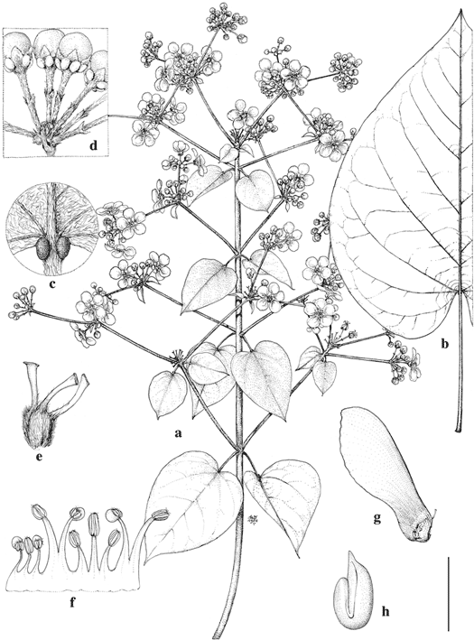 Scale bar equivalents: a, b, 4 cm; c, 4 mm; d, 8 mm; e, f, 4 mm; g, 2 cm; h, 6.7 mm. Based on: a, d–f, Hutchison et al. 6032; b, c, Cavalcante 3284; g, h, Woytkowski 5911.Drawn by Karin Douthit. First published by C. Anderson in Syst. Bot. 11: 124. 1986.awn by Karin Douthit. First published by C. Anderson in Contr. Univ. Michigan Herb. 19: 417. 1993.
