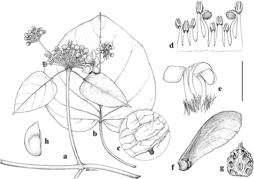 Stigmaphyllon goudotii. a. Flowering branch. b. Large leaf. c. Detail of margin and abaxial surface of lamina. d. Androecium laid flat, adaxial view, stamen second from left opposing the posterior petal. e. Gynoecium, anterior style to the right. f. Samara. g. Longitudinal section through nut of samara; note the air chambers surrounding the locule. h. Embryo. Scale bar equivalents: a, b, 4 cm; c, 2 mm; d, e, 4 mm; f, 2.7 cm; g, 1.3 cm; h, 1 cm. Based on: a, d, e, Toro 809; b, c, f, g, Goudot s.n.; h, Holton 795. Drawn by Karin Douthit. First published by C. Anderson in Contr. Univ. Michigan Herb. 19: 425. 1993.