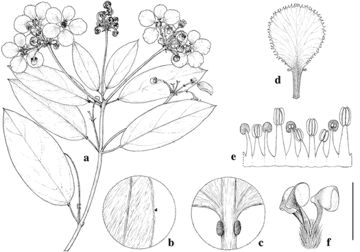 Stigmaphyllon lanceolatum. a. Flowering branch. b. Detail of abaxial leaf surface, showing dense vesture on vein and along margin, and marginal gland. c. Leaf base with petiole glands (abaxial view). d. Posterior petal; note pair of glands at base of limb. e. Androecium; stamen second from left opposes the posterior petal. f. Gynoecium. Scale bar equivalents: a, 4 cm; b, c, 4 mm; d, 8 mm; e, f, 4 mm. Based on: a, d–f, Vimecat 185, MICH; b, Boudet Fernandes 1186, MICH; c, Demuner 1040, MICH. Drawn by Karin Douthit. First published by C. Anderson in Harvard Pap. Bot. 14: 194. 2009.