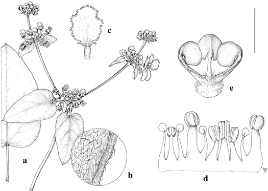 Stigmaphyllon matogrossense. a. Flowering branch and portion of large leaf. b. Detail of margin and abaxial surface of lamina. c. Posterior petal. d. Androecium laid flat, adaxial view, stamen second from left opposing the posterior petal. e. Gynoecium; posterior styles are bent slightly outward to show anterior style (in center). Scale bar equivalents: a, 4 cm; b, 1.3 cm; c, 1 cm; d, e, 4 mm. Based on Krapovickas et al. 40114, MICH. Drawn by Karin Douthit. First published by C. Anderson in Contr. Univ. Michigan Herb. 17: 14. 1990.