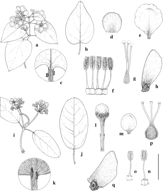 Scale bar equivalents: a, b, 4 cm; c, d, 4 mm; e, 8 mm; f, g, 2.7 mm; h, 1.3 cm; i, j, 4 cm; k, 5.7 mm; l, m, 8 mm; n–p, 2.7 mm; q, 1.3 cm. Based on: a–g, MacKee 16116, P; h, MacKee 30059, MICH; i–n, McPherson 4229, MO; o–q, MacKee 20167, P. Drawn by Karin Douthit. First published by C. Anderson in Blumea 56: 89. 2011.