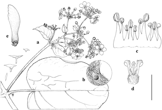 Stigmaphyllon saxicola. a. Flowering branch and several stem hairs. b. Detail of margin and abaxial surface of lamina and several laminar hairs. c. Androecium laid flat, adaxial view, stamen second from right opposing the posterior petal. d. Gynoecium, anterior style in the center. e. Samara. Scale bar equivalents: a, 4 cm (hairs 1 mm); b, 0.8 mm (hairs 1 mm); c, 2.7 mm; d, 4 mm; e, 4 cm. Based on: a–d, Hatschbach 49397, MICH; e, Hatschbach 49399, MICH. Drawn by Karin Douthit. First published by C. Anderson in Contr. Univ. Michigan Herb. 17: 17. 1990.