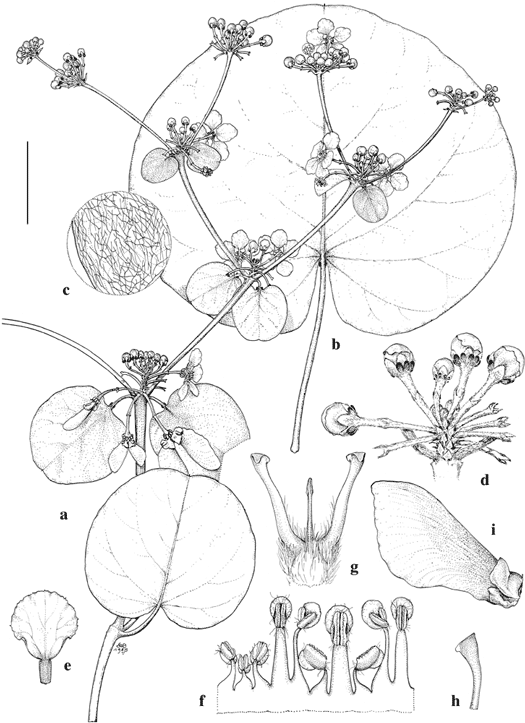 Stigmaphyllon tarapotense. a. Flowering branch. b. large leaf. c. Detail of margin and abaxial surface of lamina. d. Umbel. e. Posterior petal. f. Androecium laid flat, adaxial view, stamen second from left opposing the posterior petal. g. Gynoecium, anterior style in the center. h. Lateral view of anterior style. i. Samara.