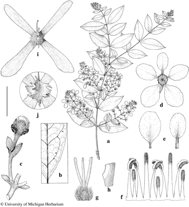 Glicophyllum maranhamense. a. Flowering branch. b. Base of lamina, abaxial view to show glands in surface. c. Flower bud, with large glands on bracteoles. d. Flower, posterior petal uppermost. e. Petals, abaxial view, lateral petal (left) and posterior petal (right). f. Androecium laid flat, abaxial view, the shortest stamen opposite posterior petal. g. Gynoecium, the anterior style in middle. h. Distal portion of a posterior style. i. Samara, adaxial view. j. Nut of samara, abaxial view. Scale bar equivalents: a, 4 cm; b, 8 mm; c, 4 mm; d, 8 mm; e, 5.7 mm; f, g, 2 mm; h, 0.5 mm; i, 8 mm; j, 4 mm. Based on: a–h, Vilhena et al. 227, MICH; i, j, Steward et al. 254, MICH. Drawn by Karin Douthit. © University of Michigan Herbarium.