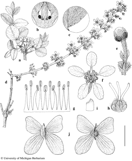 Glicophyllum ramiflorum. a. Leafy branch with fruits. b. Node showing interpetiolar stipules and glands on petioles. c. Base of leaf, abaxial view, showing marginal glands. d. Leafless flowering branch. e. Flower bud in umbel. f. Flower, posterior petal uppermost. g. Androecium laid flat, abaxial view, the stamen fifth from left opposite posterior petal. h. Gynoecium, the anterior style at right. i. Distal portion of style. j. Samaras, abaxial view (left) and adaxial view (right). Scale bar equivalents: a, 4 cm; b, c, 4 mm; d, 4 cm; e, 5 mm; f, 8 mm; g, h, 2.7 mm; i, 0.8 mm; j, 8 mm. Based on: a–c, Gottsberger 27-31083, MICH; d–i, Maguire et al. 49206, MICH; j, Nunes 171, MICH. Drawn by Karin Douthit. © University of Michigan Herbarium.