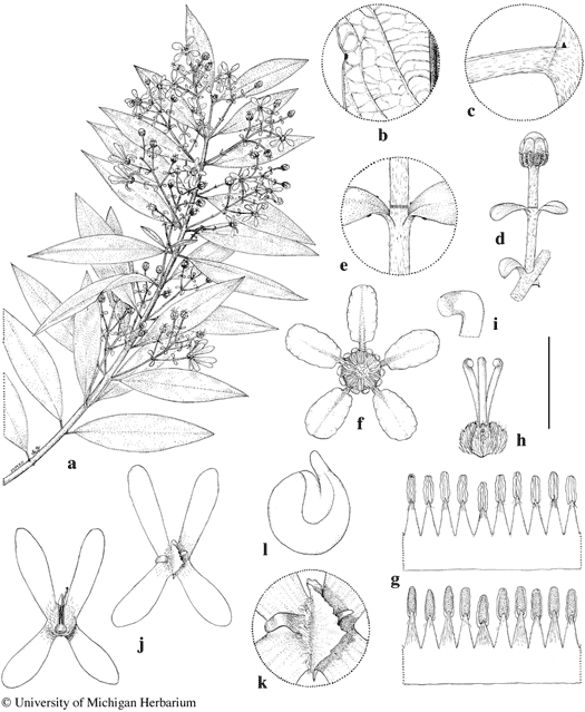a, 4 cm; b, c, 4 mm; d, 8 mm; e, 4 mm; f, 6.7 mm; g, h, 2.7 mm; i, 0.8 mm; j, 1 cm; k, 4 mm; l, 2.2 mm. Based on: a–i, Cabrera C. 5549, MICH; j–l, Matuda 3099, MICH. Drawn by Karin Douthit. © University of Michigan Herbarium.
