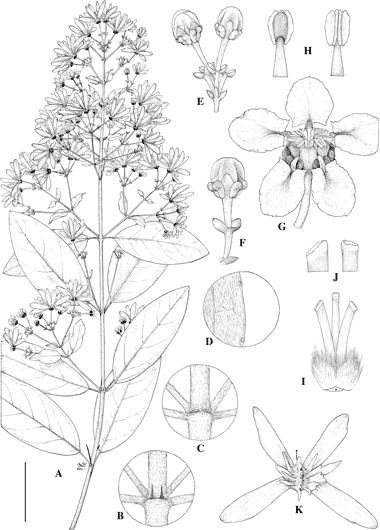Scale bar equivalents: A, 4 cm; B, C, E, 1 cm; D, G, 4 mm; F, 8 mm; H, I, 2 mm; J, 0.8 mm; K, 1 cm. Based on: A–D, K, Silva & Andrade 5444 (MICH); E–J, Reitz & Klein 3813 (MICH). Drawn by Karin Douthit. First published in Edinb. J. Bot. 77: 516. 2020; reproduced with permission of the author.