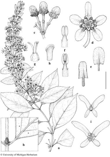 Tetrapterys discolor. a. Flowering branch. b. Node to show interpetiolar pair of connate stipules and abaxial glands at base of lamina. c. Four-flowered umbel. d. Flower, posterior petal uppermost. e. Petals, abaxial view, posterior petal (left) and lateral petal (right). f. Stamens, adaxial view (above) and abaxial view (below). g. Gynoecium with anterior style to left. h. Stigma of a posterior style. i. Samaras, adaxial view (above) and abaxial view (below). Scale bar equivalents: a, 4 cm; b, c, 8 mm; d, 5.7 mm; e, 4 mm; f, 2 mm; g, 3 mm; h, 1 mm; i, 2 cm. Based on: a–h, Tillett & Tillett 45689, MICH; i, Hoffman 3746, MICH. Drawn by Karin Douthit. © University of Michigan Herbarium.