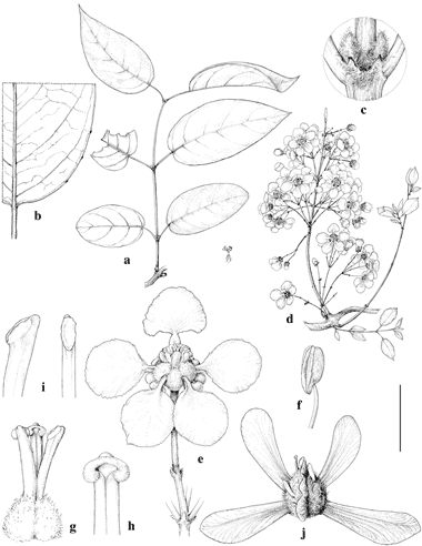 Tetrapterys mexicana. a. Leafy branch. b. Base of leaf, abaxial view, to show marginjal glands. c. Node to show interpetiolar stipules. d. Flowering branch. e. Flower, posterior petal uppermost. f. Anther, side view. g. Gynoecium, anterior style to right. h. Distal portion of posterior-lateral style, adaxial view. i. Distal portion of anterior style, side view (left) and adaxial view (right). j. Samara, abaxial view.