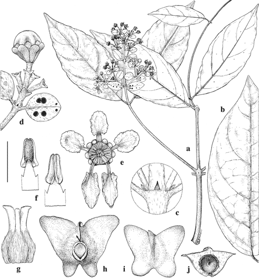 Tetrapterys natans. a. Flowering branch. b. Detached large leaf, adaxial view. c. Node with connate interpetiolar stipules. d. Umbel with one flower bud, the other three removed, subtended by reduced orbicular inflorescence leaves, the left showing adaxial surface, the right showing abaxial surface. e. Flower, posterial petal uppermost. f. Stamens, abaxial view (above) and adaxial view (right). g. Gynoecium, anterior style in center. h. Mericarp, adaxial view. i. Mericarp, abaxial view. j. Mericarp, cross-section, seed removed. Scale bar equivalents: a, b, 4 cm; c, 4 mm; d, e, 5.7 mm; f, g, 2 mm; h–j, 1.3 cm. Based on: a, c–g, Vester 700, MICH; b, i, j, Vester 744, MICH; h, Díaz et al. 211, MO. Drawn by Karin Douthit. First published by W. R. Anderson in Contr. Univ. Michigan 25: 108. 2007.