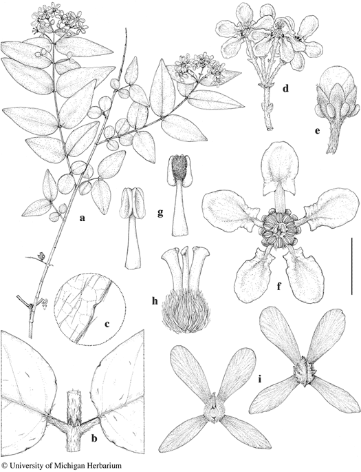 Tetrapterys schiedeana. a. Flowering branch. b. Node with stipules and adaxial view of leaf bases. c. Marginal leaf gland, abaxial view. d. Umbel. e. Flower bud. f. Flower, posterior petal uppermost. g. Stamens, adaxial view (left) and abaxial view (right). h. Gynoecium, anterior style in center. i. Samaras, adaxial view (left) and abaxial view (right).