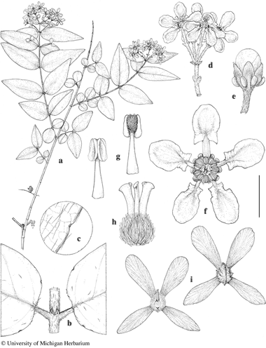Tetrapterys schiedeana. a. Flowering branch. b. Node with stipules and adaxial view of leaf bases. c. Marginal leaf gland, abaxial view. d. Umbel. e. Flower bud. f. Flower, posterior petal uppermost. g. Stamens, adaxial view (left) and abaxial view (right). h. Gynoecium, anterior style in center. i. Samaras, adaxial view (left) and abaxial view (right). Scale bar equivalents: a, 4 cm; b, 4 mm; c, 2 mm; d, 1 cm; e, f, 4 mm; g, h, 2 mm; i, 1.3 cm. Based on: a–h, McVaugh 19046, MICH; i, McVaugh & Koelz 1305, MICH. Drawn by Karin Douthit. © University of Michigan Herbarium.